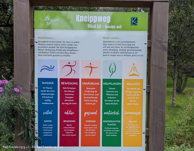 Die Tafel informiert über die 5 Kneippsäulen Wasser, Bewegung, Ernährung, Heilpflanzen und Balance. Die Tafel ist Teil des Kneippweges Bad Fredeburg.
