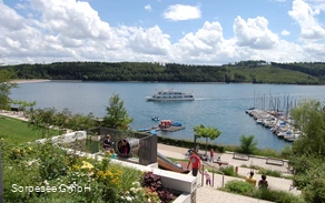 Der Kurpark von Langscheid liegt oberhalb des Sorpesees. Sie betreten den Kurpark vom See aus neben dem Hotel Seegarten oder von oben über den Hakenbrinkweg. Der Ausblick von hier auf den See ist wunderschön.