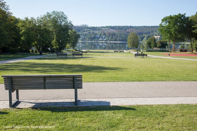 Die am Ufer angelegten Stufen der Seetreppe, eine öffentliche Badestelle, sowie die großzügigen Liege- und Aufenthaltsbereiche laden zum Verweilen am Wasser ein. Wenn Ihr ein paar Schritte gehen möchtet oder mit dem Rad unterwegs seid, könnt Ihr die getrennt voneinander angelegten Rad- und Fußwege nutzen.