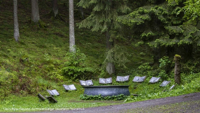 Schornsteine, die aus dem Waldboden ragen, eine Wetterfahne, Tore aus großen Ofengabeln und ein von aufgeklappten Zauberbüchern umstellter riesiger Hexenkessel in einem kleinen, von Wegen umfangenen Tal - Lili Fischer besetzt den von altersher als "Hexenplatz" bekannten Ort mit den Relikten eines vermeintlich versunkenen Hexendorfes. Ihre Arbeit gibt Zeugnis vom Mythos Hexe und versetzt Wanderer in eine Welt der Märchen und Magie. Gleichzeitig macht er jedoch auch auf die reale grausame Verfolgung von Menschen während der Zeit der Hexenprozesse aufmerksam: Auf der anderen Seite der Talsenke befindet sich der "Verhörplatz", auf dem einst vermeintliche Hexen zum Tode verurteilt wurden.