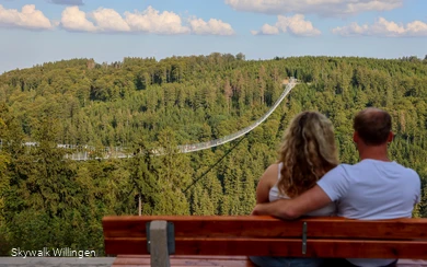 At an impressive 665 meters in length, the 120-ton structure leads from the internationally renowned Mühlenkopfschanze over the Willingen district of Stryck to the Musenberg. Visitors can look far into the distance from an impressive height of one hundred meters over the breathtaking low mountain range landscape of the Upland. At 665 meters long and 1.30 meters wide, 700 people can cross the bridge at the same time. Sufficient parking spaces are available for visitors at the Strycktal station and in the Strycktal valley. Catering is provided by the local restaurants. Both entrances to the bridge on the Schanzenberg and Musenberg sides are extremely attractive for starting further excursions from there, for example to the Ettelsberg and the adjacent Hochheide or in the direction of Usseln to the Graf Stolberg Hütte.
