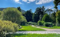Spa park in the Kneipp spa town of Saalhausen with romantic small lakes, treading pool, barefoot adventure trail and music pavilion