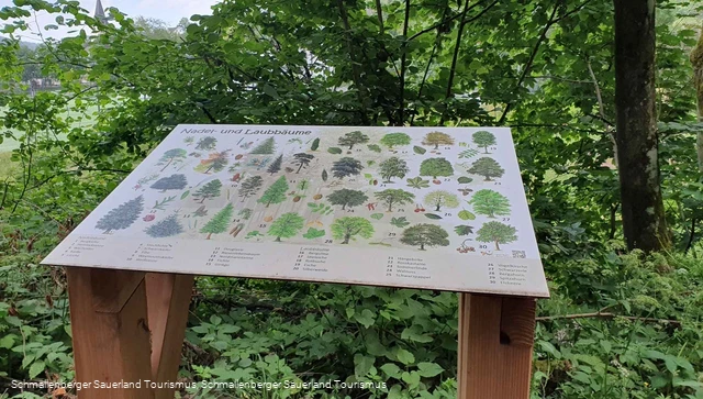 Het informatiebord "Naald- en loofbomen" op het bosnatuurpad in Hagen geeft informatie over de verschillende bomen in de regio.