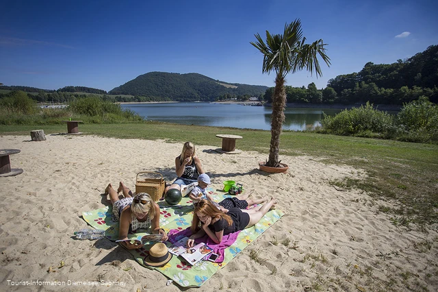 Je kunt ontspannen en genieten van de zon op de zandstranden . Voor de jongere gasten zijn er speeltoestellen beschikbaar. Een reuzenwaterglijbaan rondt de ervaring af, net als een elektrische boottocht over de Diemelsee