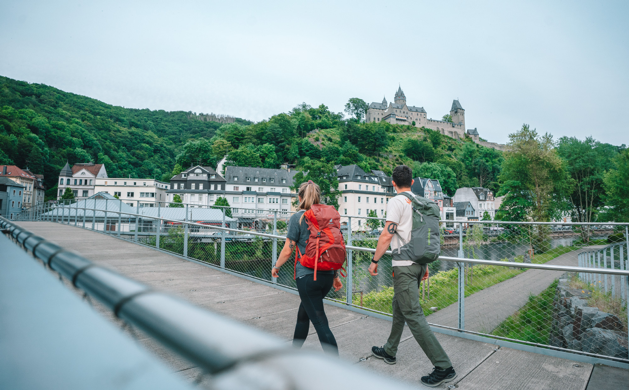 Wanderer unterwegs zu Burg Altena – sie ist eine von vielen historischen Sehenswürdigkeiten im Sauerland, die im Rahmen der Onlinekampagne vorgestellt werden.